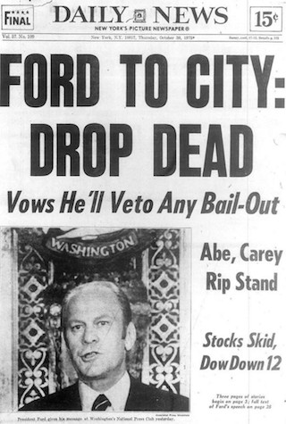 On October 30, 1975, the New York Daily News published its classic “FORD TO CITY: DROP DEAD,” issue, when President Gerald Ford rejected federal loans to the city, which was near financial disaster.