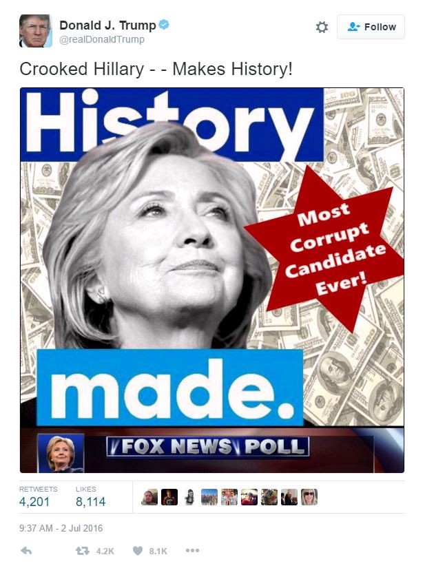 On Saturday, Donald Trump, the presumptive presidential nominee of the Republican Party, tweeted an anti-Semitic attack on the presumptive democratic nominee, Hillary Clinton. The tweet was a collection of anti-Semitic tropes — a pile money, a star of David and the words “Most Corrupt Candidate Ever.”