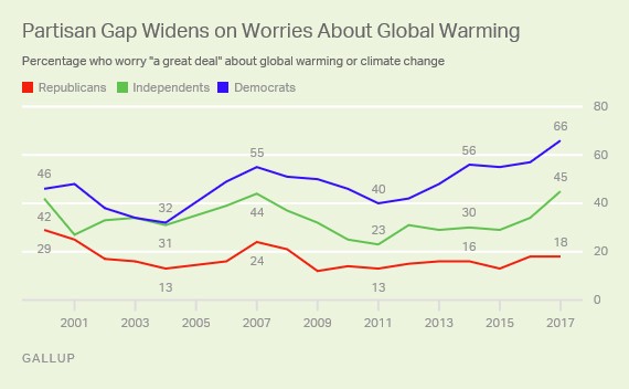 Republican concern about global warming is the same as it was in 2016, but concern by independents jumped a remarkable 15 percentage points.