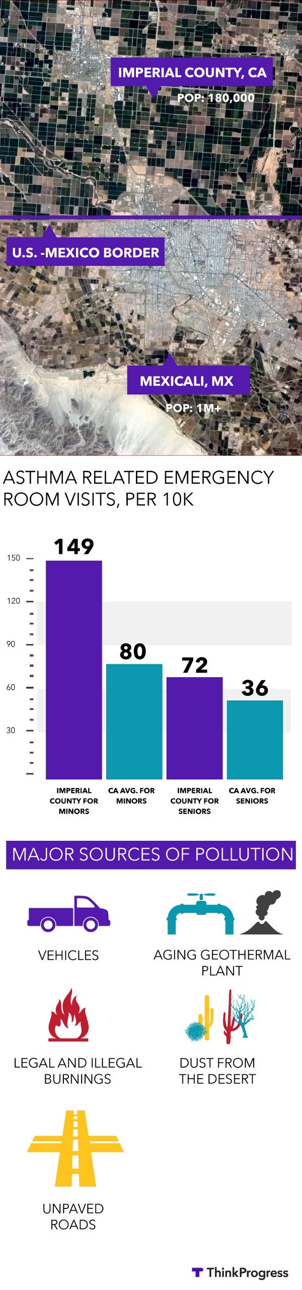 Imperial is also ground zero for asthma hospitalizations and emergency room visits among minors and the elderly, the two most vulnerable groups. For asthma, the county has far exceeded state averages for almost a decade, according to state data submitted to ThinkProgress.