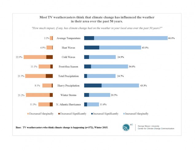 A recent survey added to the anecdotal evidence that this shift is underway by finding that more than 9 in 10 TV weathercasters have concluded that climate change is happening. Of these, nearly 9 in 10 think human activity is at least partly responsible over the past 50 years. The survey, conducted by the George Mason University (GMU) Center for Climate Change Communication on 464 broadcast meteorologists, represented a significant increase from a similar 2010 survey, when 54 percent of weathercasters nationwide were convinced that the climate was changing, 25 percent were unconvinced, and 20 percent were undecided — and, of those, only about 65 percent felt human activity was at least half to blame.