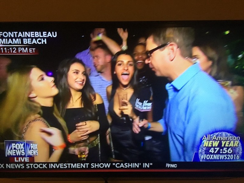 9:30: We now throw to Fox News personality Griff Jenkins, who is reporting from The Fontainebleau hotel in South Beach. He is dancing very awkwardly with two women.