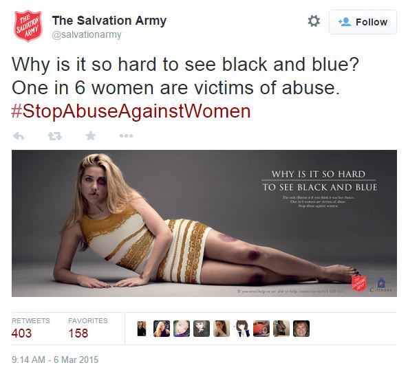 The South African branch of the Salvation Army — an international Christian-affiliated charity that operates in more than 100 countries — is sharing an advertisement for a domestic violence shelter that features what’s come to be known simply as The Dress. Hailed as “powerful” and “brilliant” in AdWeek, the PSA features a bruised woman wearing the white and gold version of the now infamous clothing item: