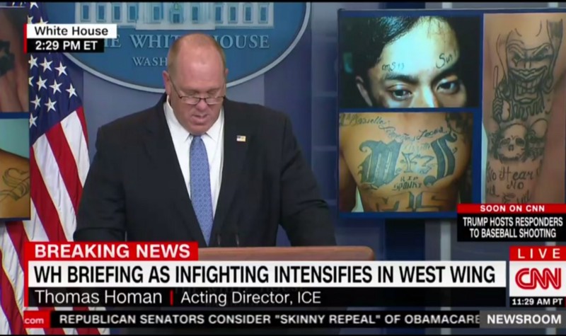 During a White House press briefing Thursday, U.S. Immigration and Customs Enforcement (ICE) Acting Director Thomas Homan said his agency would crack down forcefully on immigrant-friendly cities and on gang members who enter the country illegally. He did all this while standing between two television monitors showing photos of shirtless, tattooed men, whom he said were gang members.