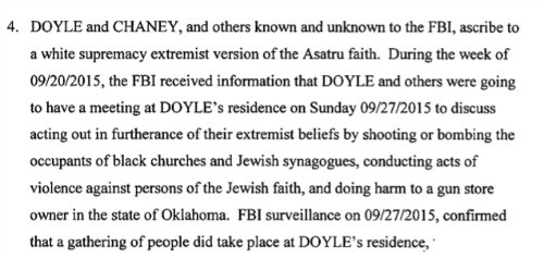 The FBI claims that Robert Doyle and Ronald Beasley Chaney were holding a meeting “to discuss acting out in furtherance of their extremist beliefs by shooting or bombing the occupants of black churches and Jewish synagogues, conducting acts of violence against persons of the Jewish faith, and doing harm to a gun store owner.” The two were charged with conspiracy to buy firearms as convicted felons. Another man, Charles Halderman, was charged with conspiracy to commit robbery.