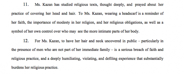“The prohibition on Ms. Kazan’s use of a religious headcovering pursuant to the above-described custom, practice, or policy violated her right to the free exercise of her religion, violated her rights under federal law, and caused her extreme mental and emotional distress,” the lawsuit states.