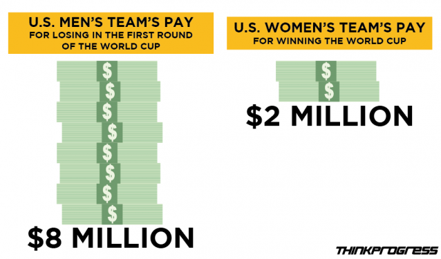 The women’s team also gets nothing for playing in World Cup matches until they get into fourth place, even though the men’s team gets payment for each game played regardless of the result. They got just $2 million for winning the World Cup last year, while the U.S. men’s team earned $8 million for losing in the first round. Meanwhile, the German team that won the men’s World Cup got $35 million.