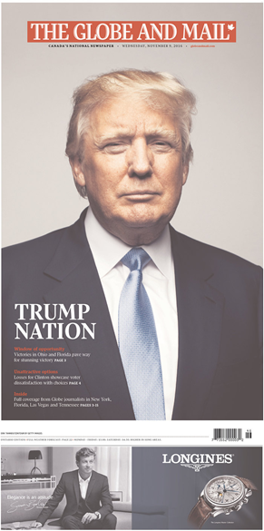 The Globe and Mail dedicated almost its entire front page to a picture of Trump on Wednesday, declaring a “Trump nation.”