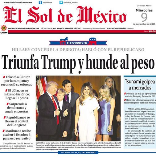 At the onset of his campaign, Trump aggressively claimed that Mexican immigrants were murderers, rapists, and criminals. He also promised that a border wall would be built along the southern U.S. border to prevent unauthorized migration, suggesting that the Mexican government would pay. After Trump’s victory was announced late Tuesday night, the Mexican peso sank to a record low on investor fears of the dissolution of exports deals between the two countries, with El So de Mexico, a Mexico City-based newspaper’s lead headline blaring “Trump triumphs as peso sinks.”