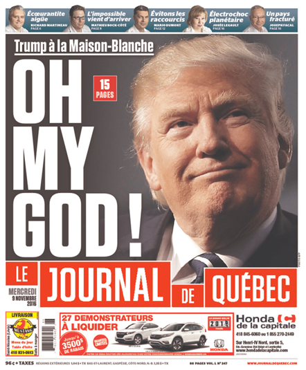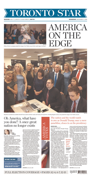 “Politics, America changed forever,” read a piece on the front page of the Winnipeg Free Press. “Fear disguised as hope as the unthinkable happens: Donald J. Trump is president-elect,” read another piece in the Winnipeg Metro. “In the aftermath of the last two years of campaigning, America — and the world at large — will have to contend with what has been wrought. The racist, hate-filled angry mewling underbelly of American politics has been given voice. And now, it has been given a home in the Oval Office.”