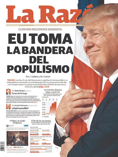 Another Mexican newspaper La Razón included a picture of Trump embracing the U.S. flag under the headline, “United States takes the flag of populism,” condemning Trump as a clown and a scammer.