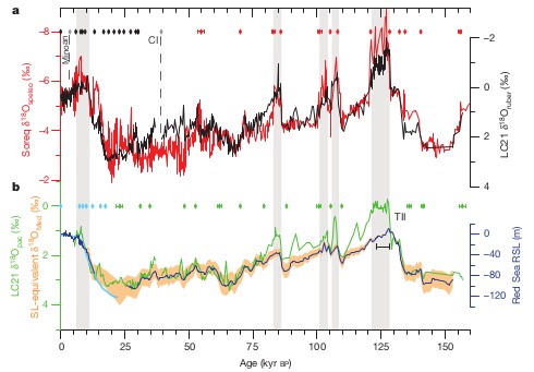 Figure 3a — Correlation of Soreq Cave (red line) and eastern Mediterranean (black line) oxygen-18 isotope signals. 3b — Eastern Mediterranean Sea oxygen-18 isotope record from another foram species (green line) and the highest probability sea level curve (blue line). The coloured dots and grey-shaded columns denote other paleodata used to validate and synchronize the reconstructions. From Grant (2012).