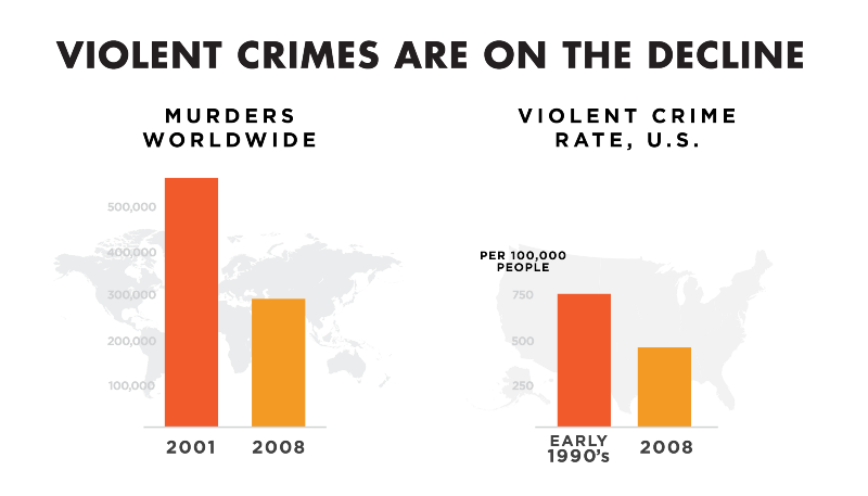 Pinker’s trend against violence isn’t limited just to war. It seems likes crimes, both of the sort states commit against their citizens and citizens commit against each other, are also on the decline.
