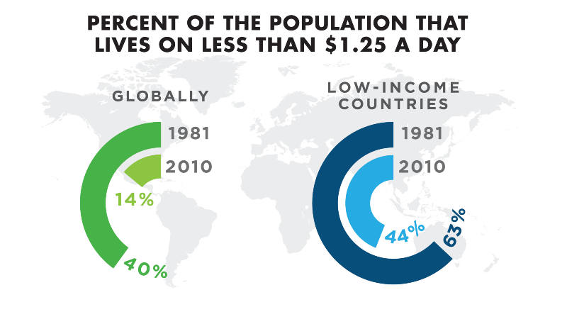 721 million fewer people lived in extreme poverty ($1.25 a day) in 2010 than in 1981, according to a new World Bank study from October. That’s astounding — a decline from 40 to about 14 percent of the world’s population suffering from abject want. And poverty rates are declining in every national income bracket: even in low income countries, the percentage of people living in extreme poverty ($1.25 a day in 2005 dollars) a day gone down from 63 in 1981 to 44 in 2010.