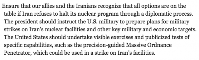 The part where he says we need to start conducting military exercises that demonstrate our willingness to declare war on Iran