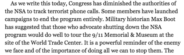 The part where he says that people who are skeptical about the NSA need to visit the 9/11 memorial at the World Trade Center