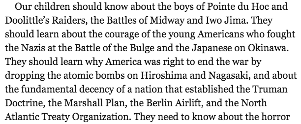 The part where he says that America’s school children need to be taught about the unambiguous morality of dropping a nuclear bomb on a heavily populated city
