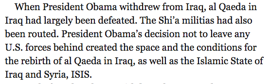 There part where he claims things were going great in Iraq until Obama took office