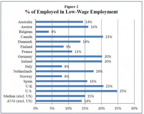 Single parents in the United States also fare worse than their international counterparts when it comes to employment. A huge percentage of single American parents — 25 percent — hold low-wage jobs, higher than any other developed country in the study: