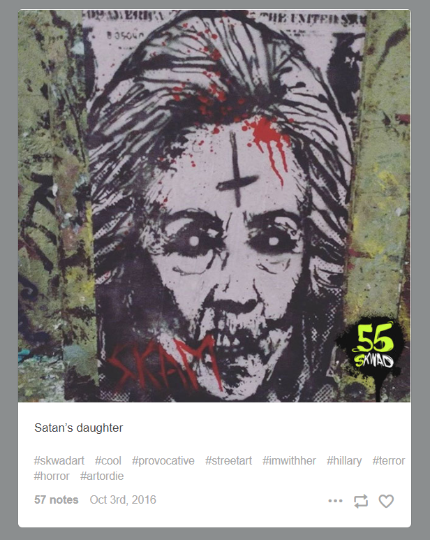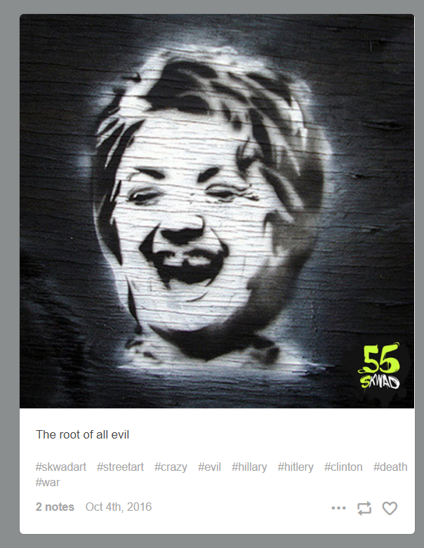 Moreover, the “Black Matters US” site links to a podcast the site put together, known as “SKWAD 55.” The podcast – which, according to “Black Matters US,” provides “strong Black voices” and “[d]elightful music from the streets strait to your hearts! [sic]” – further maintained its own Facebook and Instagram accounts, which have also since been removed, as well as a Tumblr account that posted, among other things, descriptions of Hillary Clinton as “Satan’s daughter,” “The root of all evil,” and “Himmlery aka (‘Death for Dollars’) – ‘The Benghazi Bullshitter.’”