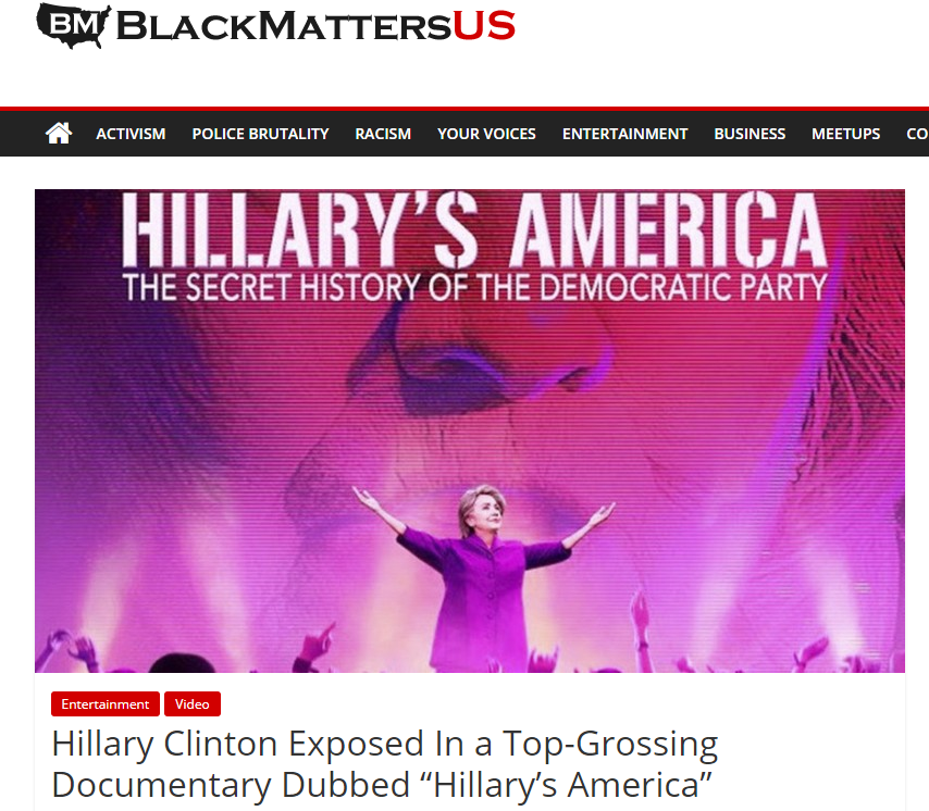 The site also pushed a notable stream of anti-Clinton material, including describing Clinton as a “Candidate For the Corporate Elite” and asking if “The Clintons [are] Playing Their Usual Election Tricks On Blacks[.]”