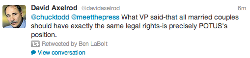 Politico notes that a Biden spokesperson has issued this statement: The Vice President “was saying what the President has said previously-that committed and loving same-sex couples deserve the same rights and protections enjoyed by all Americans, and that we oppose any effort to rollback those rights.” Read the full statement here.