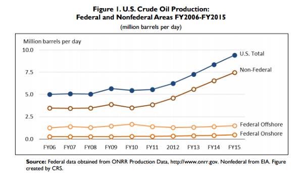 The charts below show the relatively consistent production of both onshore and offshore oil and natural gas on federal land and waters. The charts were prepared by the nonpartisan Congressional Research Service for a 2016 report, in which the group notes, “having more lands accessible may not translate into higher levels of production on federal lands, as industry seeks out the most promising prospects and higher returns which in recent years have come on more accessible non-federal lands.”