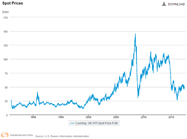 The above chart shows the dramatic fluctuations in oil prices over the past 20 years. The high point of that chart represents July 2008.
