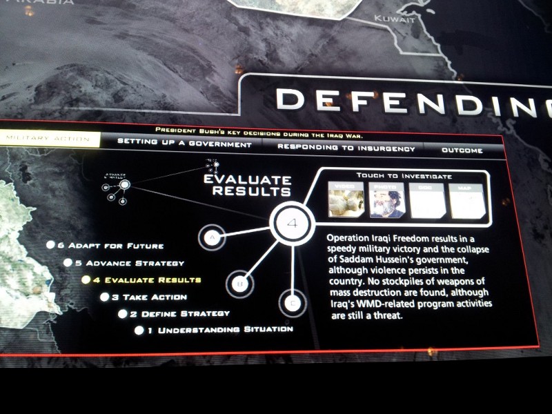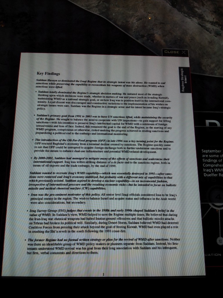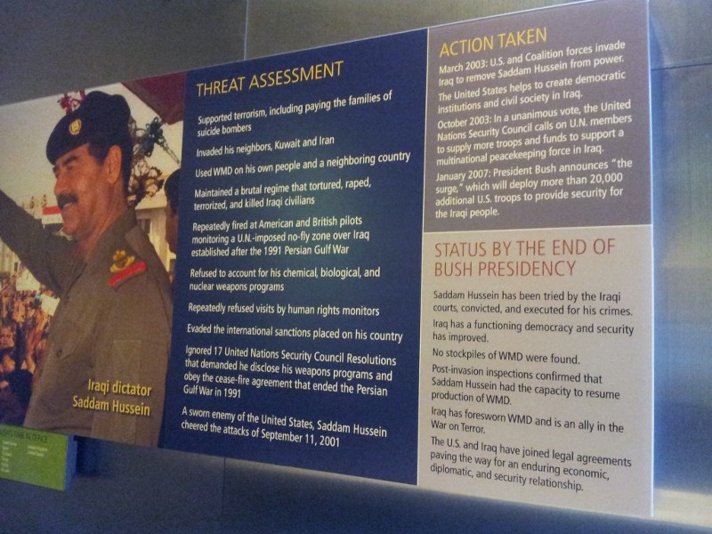 For example, the museum has a big display detailing the “Threat Assessment” of Saddam Hussein, followed by the “Status by the end of Bush presidency”. One curt sentence among the 44 lines notes that “No stockpiles of WMD were found.” Meanwhile, twelve lines are devoted to the possible presence of WMDs in Iraq before the war and how we never have to worry about that now post-war, including that Saddam “refused to account for his chemical, biological, and nuclear weapons programs” and that “post-invasion inspections confirmed that Saddam Hussein had the capacity to resume production of WMD.”