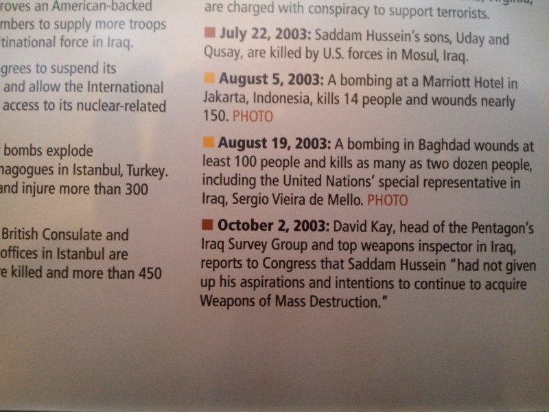 A timeline nearby also gives the impression that Saddam was on the cusp of attaining WMDs, stopped only by Bush’s decision to go to war: