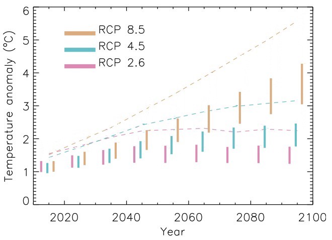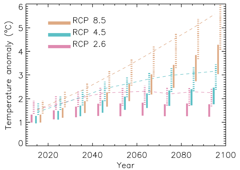 In these figures, the dashed lines in the horizontal direction are the projections from the unconstrained climate model for the three emissions scenarios (the RCPs). The solid vertical lines are the model projections using the 1851–2010 data, and the dotted vertical lines (deleted by Michaels) are the model projections using the 1901–2000 data.