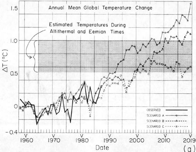 Climate scientists aren’t in the business of predicting how human greenhouse gas emissions will change in the future — that is a policy question. Instead, climate scientists predict how the climate will change in response to a series of possible emissions scenarios (for example, continuing with business-as-usual emissions, dramatically cutting our emissions starting in the year 2020, etc.). In 1988, Hansen used the NASA GISS climate model to predict how the planet would respond to three possible scenarios. Scenario A assumed continued exponential (accelerating) greenhouse gas growth. Scenario B assumed a reduced linear rate of growth, and Scenario C assumed a rapid decline in greenhouse gas emissions around the year 2000. Hansen believed Scenario B was the most likely to come to fruition, and indeed it has been the closest to reality thus far. In the summer of 1988, Hansen presented his results in testimony before U.S. Congress.