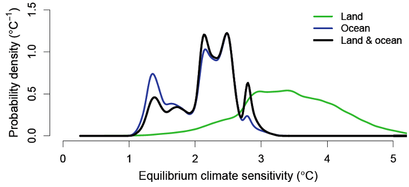 This is an important caveat because climate sensitivity applies to the planet as a whole. If different results are obtained from ocean and land data, then we can’t be sure which is correct, and in fact many climate scientists are skeptical of the small LGM temperature change estimate, which is based heavily on the ocean temperature data. Thus Schmittner et al. felt it important to include both estimates in the figures in their study.