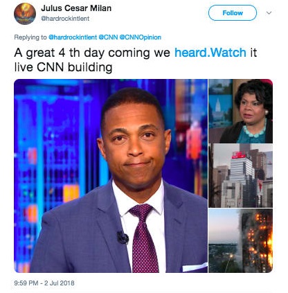 BuzzFeed News also screengrabbed a threatening tweet sent to CNN days before July 4th with an image of a building on fire.