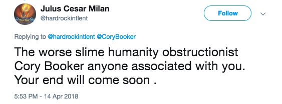 BuzzFeed News took a screenshot of an April tweet to Sen. Cory Booker (D-NJ) that warned “Your end will come soon.”