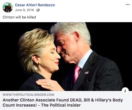 The same Facebook account also said “Clinton will be killed” in a post that spread conservative misinformation about the former First Lady.