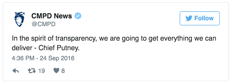 The Charlotte Police Twitter feed posted this tweet about transparency and release of information, but subsequently deleted it (screenshot below).