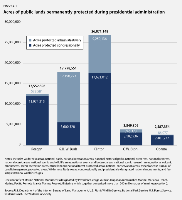 The graph above includes federal public lands that have been permanently protected by Congress or the president. “Permanently protected” lands are defined here as those lands that would require an act of Congress to change their designation and/or level of protection — such as national parks, national monuments, wilderness areas, and many others. Areas that have been just temporarily protected — such as the 20-year withdrawal of 1 million acres around the Grand Canyon from mining — are also not included. Similarly, congressional mineral withdrawals are not included as they offer protection only from mineral extraction. And finally, only federal public lands are incorporated, so places like national wildlife refuges that have been created through easements on private property are not a part of the graph.