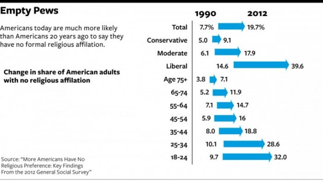 Part of the reason for this rapid growth is generational. Both Pew and the GSS indicate that among the youngest Millennial adults — those born 1990–1994 — around a third have no religious affiliation. Another reason is dissatisfaction with the political activities and conservative social stance associated with much of organized Christianity. This is driving many liberals and moderates toward a more personal approach to worship and spirituality. It is also helping to fuel the move away from formal church attendance. According to the GSS, the proportion of the population attending services only once a year or less has increased from 29 percent in 1972 to 44 percent today.