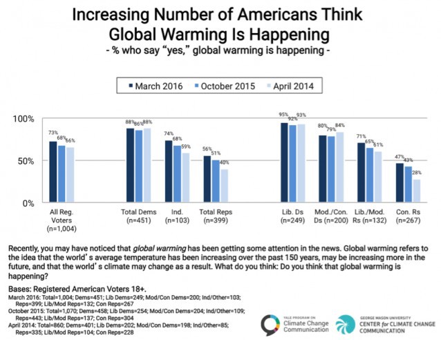 The new survey found a growing number of registered voters understand global warming is happening: “Three in four (73%, up 7 points since Spring 2014) now think it is happening. Large majorities of Democrats — liberal (95%) and moderate/conservative (80%) — think it is happening, as do three in four Independents (74%, up 15 points since Spring 2014) and the majority of liberal/moderate Republicans (71%, up 10 points).”