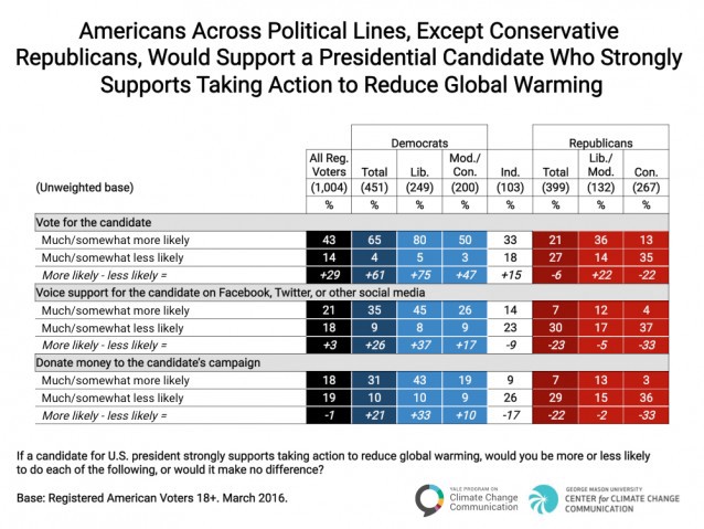 The researchers found that the number of Americans who are “more likely to vote for a presidential candidate who strongly supports taking action to reduce global warming,” exceeds the number who would be less likely to vote for such a candidate by a factor of 3-to-1 (43 percent to 14 percent).