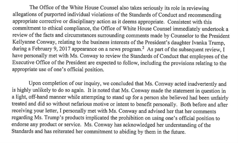 “We concluded that Ms. Conway acted inadvertently and is highly unlikely to do so again,” Passantino wrote. “Ms. Conway has acknowledged her understanding of the standards and has reiterated her commitment to abiding by them in the future.”