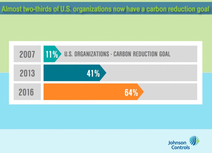 Specifically, Johnson Controls found that 64 percent of American companies “now have an internal or publicly stated carbon reduction goal, compared to 41 percent in 2013.”