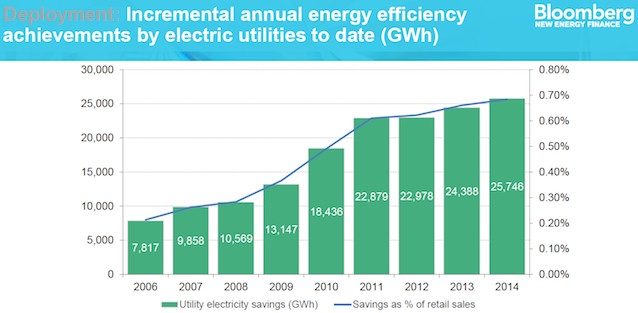 As a result of these policies, utility efficiency spending is up four-fold since 2006, and so “since 2007, incremental efficiency achievements have risen 17% on average annually.”