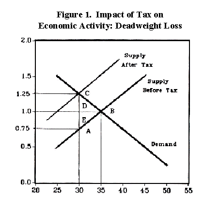 That reduces the consumer surplus and the producer surplus. But that lost surplus doesn’t just vanish, it’s basically being taken by the government and turned into tax revenue and public expenditures. But it’s not all taken by the government; some fraction of it — the triangle represented by D and E in the chart — really does just vanish. That’s the “deadweight loss” the value, to producers and consumers alike, of transactions that would have happened at the un-taxed price but didn’t happen at the taxed price. This, rather than the “cost” in taxes paid, represents the real social cost of a new tax.
