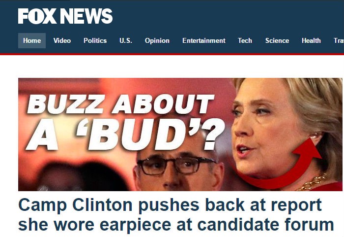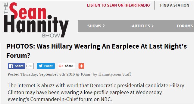 The Infowars piece is basically an aggregation of tweets from conservative actor James Woods and a True Pundit article that cites unnamed sources and fuzzy photos to “report” that Clinton “was sporting a mini earbud wired to receive stealth communications from her campaign handlers” during the event, which was broadcast live on NBC. Less outlandish possibilities aren’t considered.