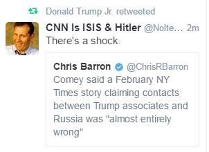 Donald Trump Jr. tweeted or re-tweeted a total of 50 times during Comey’s testimony, proving once again that the apple does not fall far from the tree. There were poorly threaded rants, out-of-context reactions, and dozens of RTs of right-wing accounts, one which had the name “CNN is ISIS & Hitler.”