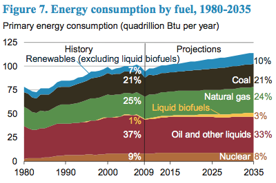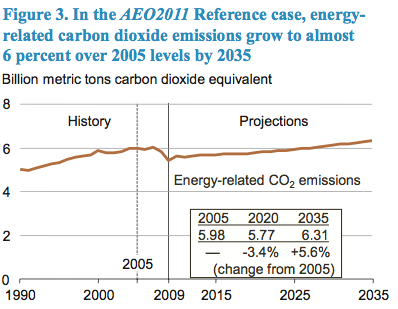 The U.S. Energy Information Administration has projected that the United States will lead the world into catastrophic global warming over the next twenty five years. In its 2011 Annual Energy Outlook, the EIA predicts that energy-related CO2 emissions will “grow by 16 percent from 2009 to 2035,” reaching 6.3 billion metric tons of carbon dioxide equivalent (or 1.7 GtC):