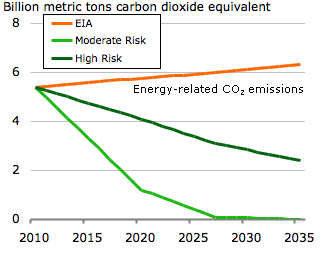 Friends of the Earth UK’s latest report, “Reckless Gamblers,” reflects the science in its recommendations for immediate and significant cuts in climate pollution, while admitting that there are significant global-scale risks that come even with that effort. If future pollution is distributed on a per-capita basis, then net United States emissions would need to go to zero by 2030 (a similar effort by top climate institutes finds the US pathway goes to zero by 2020). Comparing the EIA pathway for energy-related CO2 emissions — which represent about 83 percent of total US greenhouse pollution — to the range of merely dangerous emissions pathways: