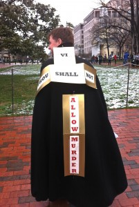 Hundreds of participants braved wintry conditions on Monday morning as they gathered in front of St. John’s Church for the event, with many attendees wrapping heavy scarves around their clerical collars and brandishing signs that read “Stop the killing of our children” and “Thou shall not allow murder.”